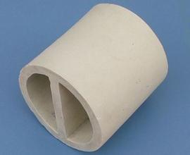 陶瓷一字環是基于增加填料的比表面以強化傳質效率的想法之上而開發出來的,其結構是在拉西環中增設了一字隔板。一般來講,陶瓷一字環填料由于尺寸較大,僅適用于整齊堆砌,目前一般只作為亂堆填料的塔底支撐分布層用。Φ80-200mm規格的十字隔板環可作支承材料,空隙率大于60%,個數為整聚數。