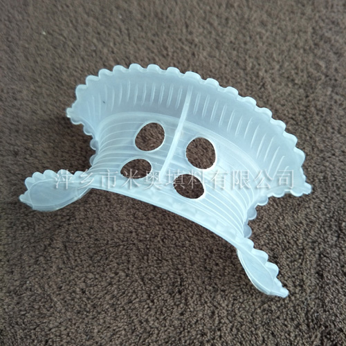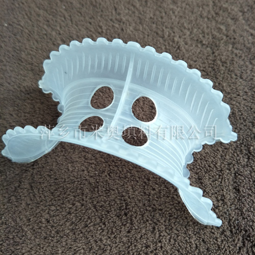 塑(su)料異鞍環是20世紀70年代美國Noton公(gong)司對普通矩鞍環填(tian)料作出了改進,其特點是將扇形弧面改(gai)進成帶鋸齒(chi)邊(bian)緣的貝殼狀弧面,并在鞍背上增加(jia)了(le)開孔(kong),這(zhe)樣填(tian)(tian)料(liao)層(ceng)內的(de)通(tong)(tong)(tong)道更加(jia)通(tong)(tong)(tong)暢,改善了(le)液(ye)體(ti)分布性能(neng),降低了(le)氣體(ti)通(tong)(tong)(tong)過(guo)的(de)阻力(li),提高了(le)傳質性能(neng)。塑料(liao)異鞍環(huan)鞍形(xing)填(tian)(tian)料(liao)類似(si)于馬鞍形(xing)狀,這(zhe)種填(tian)(tian)料(liao)層(ceng)中主要為弧(hu)形(xing)的(de)液(ye)體(ti)通(tong)(tong)(tong)道,填(tian)(tian)料(liao)層(ceng)內的(de)空隙較環(huan)形(xing)填(tian)(tian)料(liao)(尤(you)其較拉(la)西(xi)環(huan)填(tian)(tian)料(liao))更加(jia)連(lian)續(xu)。
